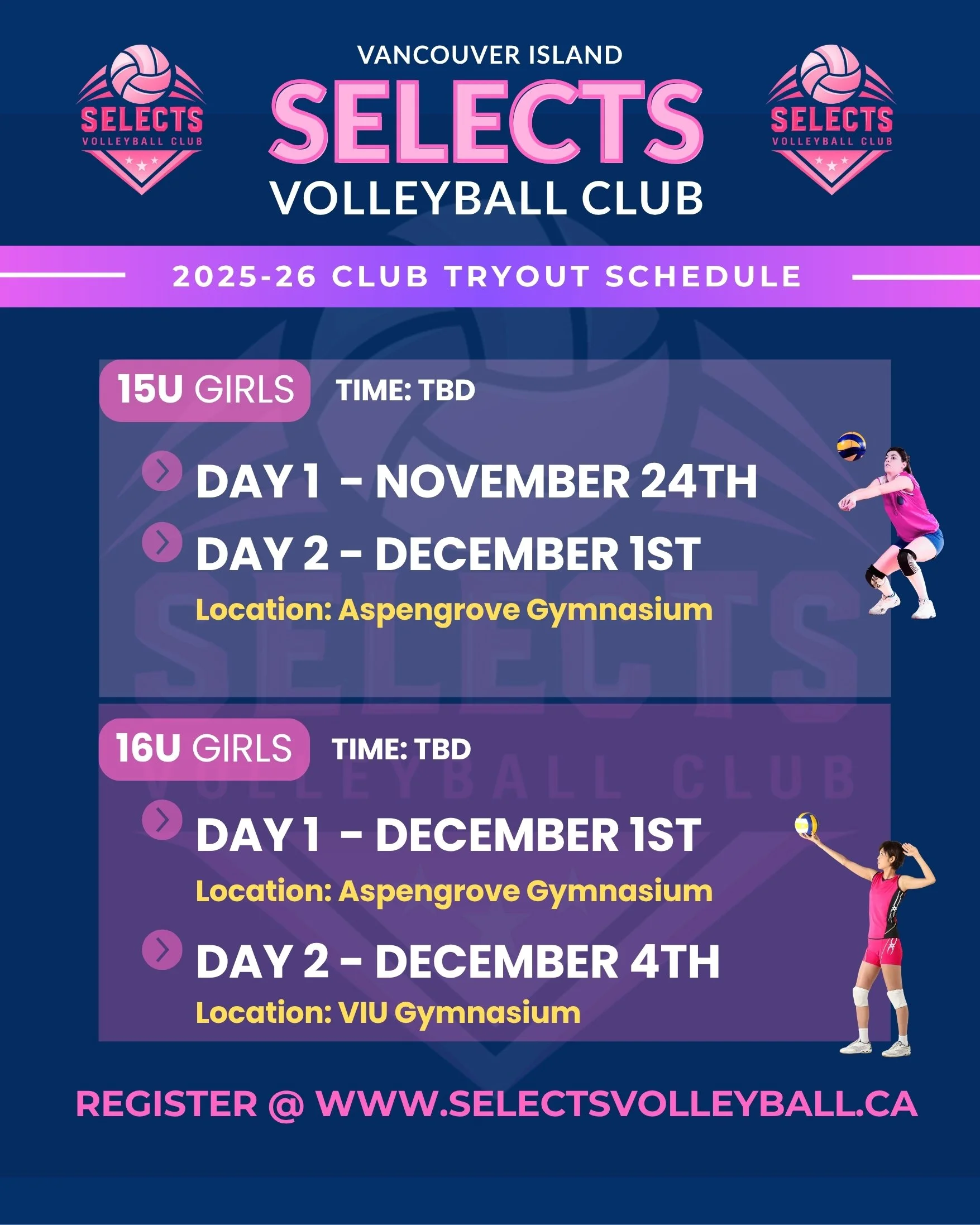 Selects Volleyball Club welcomes athletes from all over Vancouver Island. All athletes interested in joining the SVC are required to attend tryouts. We look forward to seeing you there!
